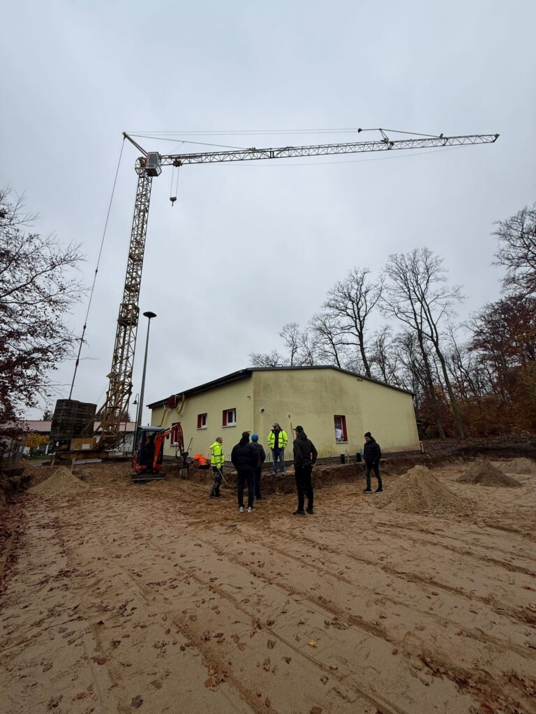 Das Foto zeigt gut, wie das Gelände vorbereitet wird – Sand und Schotter wurden eingebracht, die Baufläche wurde angeglichen, und die Baufirma ist mit schwerer Technik im Einsatz. In den kommenden Wochen folgen die Fundamentarbeiten, bevor im weiteren Verlauf der Rohbau entstehen kann.